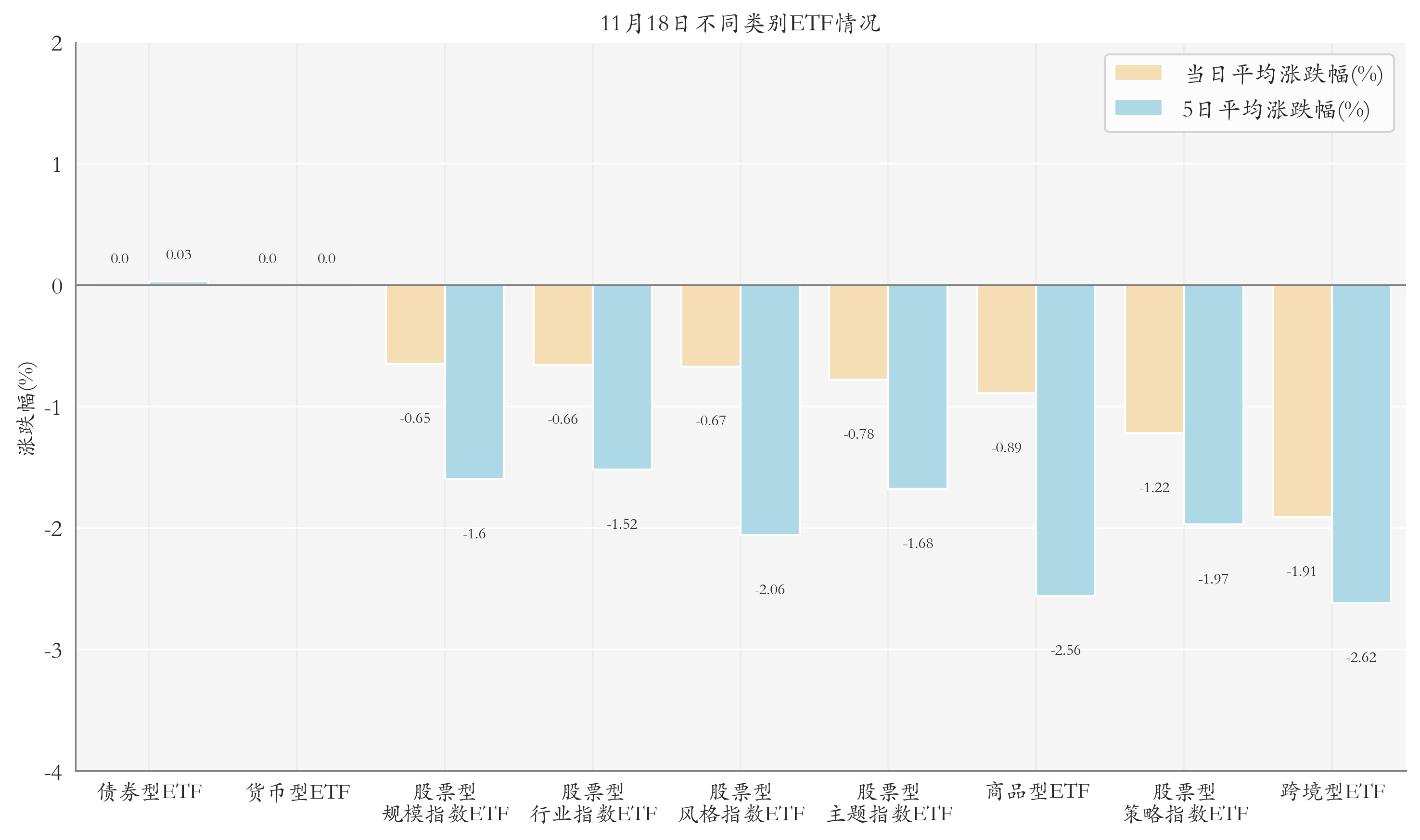 阐明ETF基金的投资范围,将ETF基金折柳为股票型领域指数ETF、股票型行业指数ETF、股票型计谋指数ETF、股票型立场指数ETF、股票型主题指数ETF、债券型ETF、商品型ETF、货币型ETF、跨境ETF,本日债券型ETF进展最优,该类ETF的平均涨跌幅为0.00%;跨境型ETF的进展最差,该类ETF的平均涨跌幅为-1.91%。