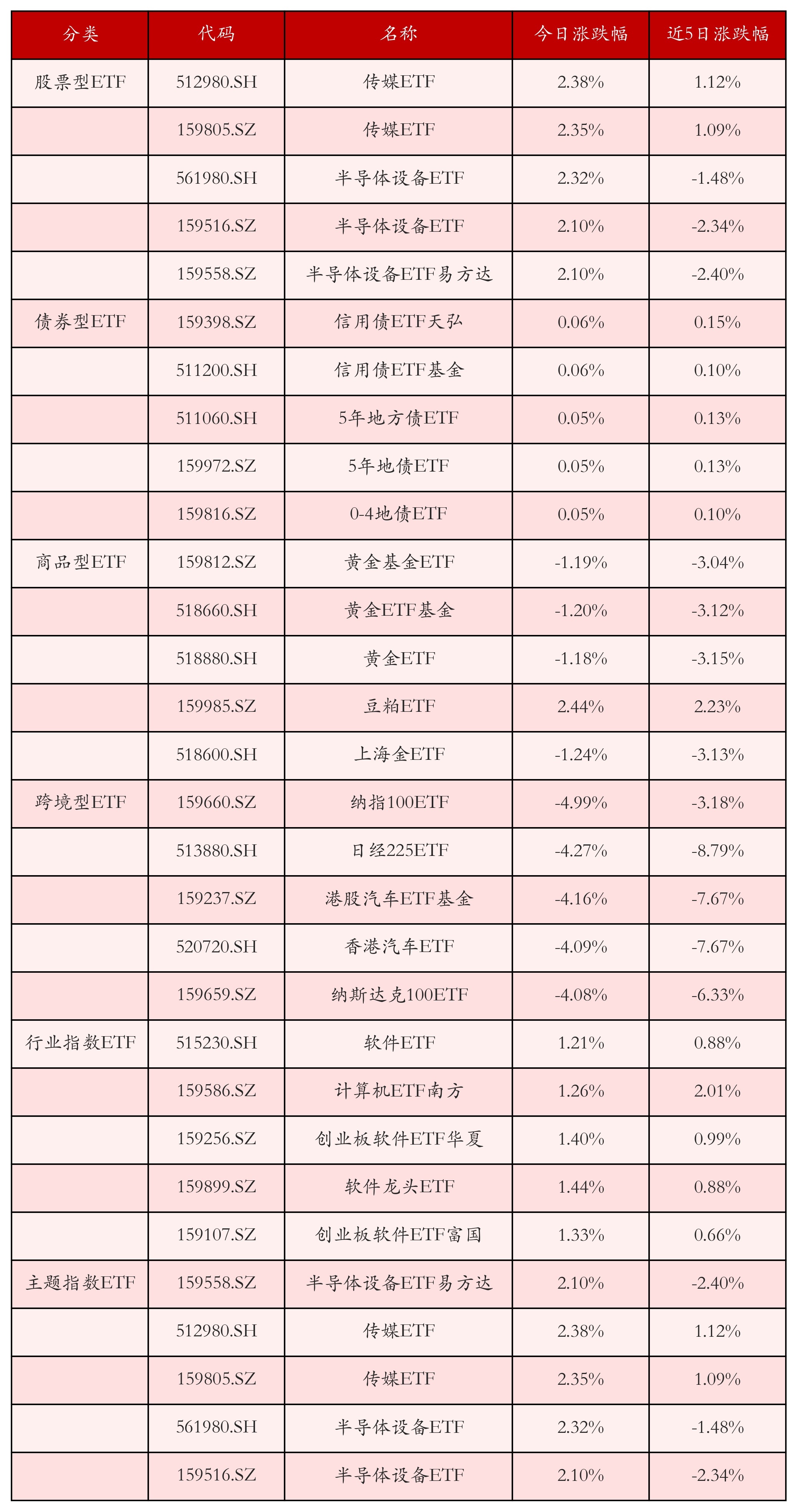 从不同投资种类、行业、主题的ETF居品中找出本日走势行情名次前5的ETF基金,本日涨幅靠前的ETF居品如下表所示。股票型ETF中涨跌幅名次前3位的ETF居品分别为传媒ETF(512980.SH)、传媒ETF(159805.SZ)和半导体开拓ETF(561980.SH),本日收益率分别为2.38%、2.35%和2.32%。