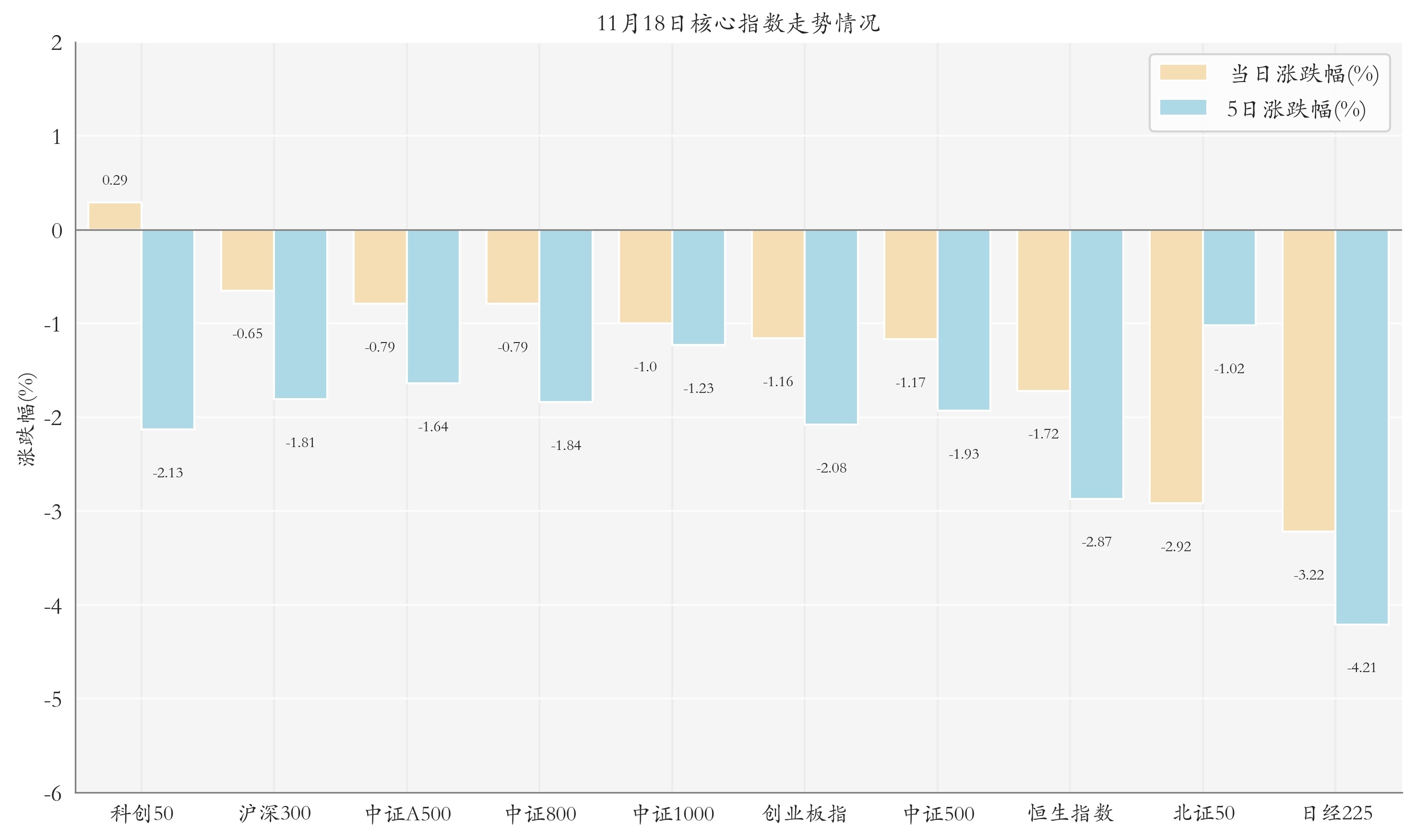 统计A股与国外主要中枢指数走势,本日(11月18日,下同)三大指数集体下落,其中上证指数下落0.81%,收于3939.81点,日内最高3966.89点;深证成指下落0.92%,收于13080.49点,日内最高13223.12点;创业板指下落1.16%,收于3069.22点,日内最高3115.31点。本日科创50、沪深300与中证A500走势名次靠前,日涨跌幅分别为0.29%、-0.65%与-0.79%;近5个交当年北证50、中证1000与中证A500的走势名次靠前,近5日涨跌幅分别为-1.02%、-1.23%与-1.64%。